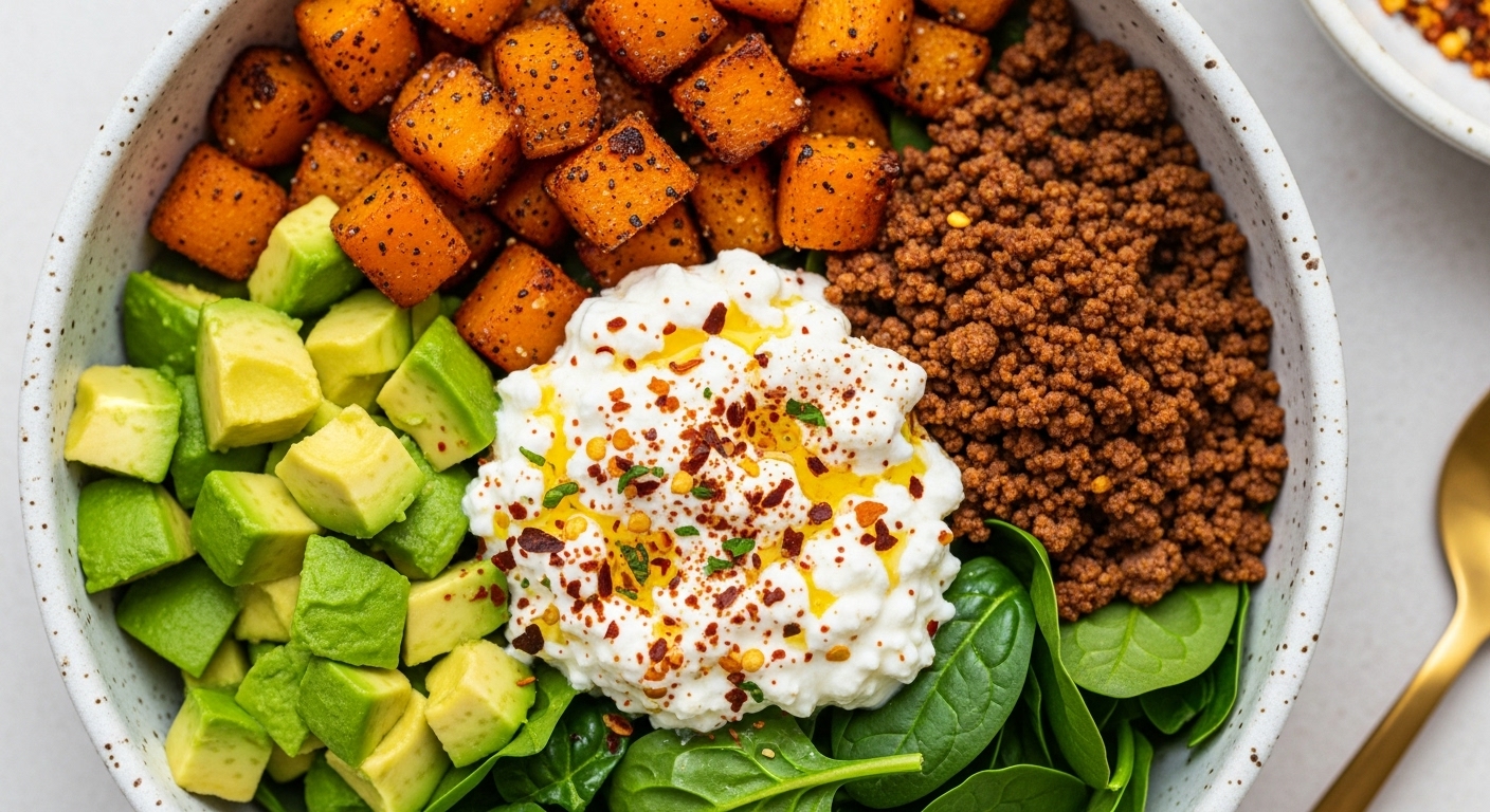 - 16 oz 2% cottage cheese – Adds a cool, creamy contrast to the seasoned beef and warm sweet potatoes (about ½ cup per bowl).
